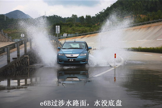 在纯电动车的推广过程中,用电的安全性是大家顾虑较多的地方,特别是e6B的动力电池平铺在底盘上,因此对底盘的防水密闭性要求极高。上图为比亚迪e6B驶过深达150mm~300mm的涉水路段。据悉由于纯电动车没有排气管不怕进水熄火,因此其涉水能力要高于普通燃油车,即使骤降暴雨也能乘风破浪不会"趴窝"。