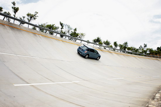 给笔者最大惊喜的是一组e6B"飞檐走壁"的照片,图片上的e6B在近乎垂直的高环跑道上飞驰如履平地,时速可想而知。据悉目前e6B正在进行24小时不间断高速环道测试,人歇车不歇,从而测试车辆的可靠性。