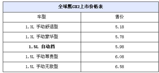 近日,吉利汽车旗下全球鹰品牌GX2(报价 图片 参数)新增一款1.5L自动挡车型,而其售价为5.98万元人民币。由此GX2全系共有五款车型,价格为:5.18~6.58万元。具体情况请参照下表: 全球鹰GX2上市价格表: