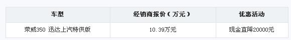 荣威4S店获悉,为迎接第十届天津梅江车展的到来,店内特推出荣威350讯达上汽特供版原价103900元,现金直降2万元!详情请具体价格详情如下表: