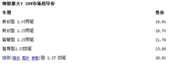 东风裕隆的首款产品——纳智捷大7(报价 图片 参数) SUV将在本月30日正式上市,不过近日从官方的相关渠道提前获悉了该车的市场指导价,其价格区间为18.8-26.8万元。具体价格请见下表: