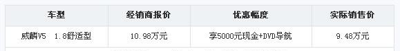 日前,云南中麟汽车服务有限公司了解到,购威麟V5享5000元现金+DVD导航。具体车型和优惠如下表:
