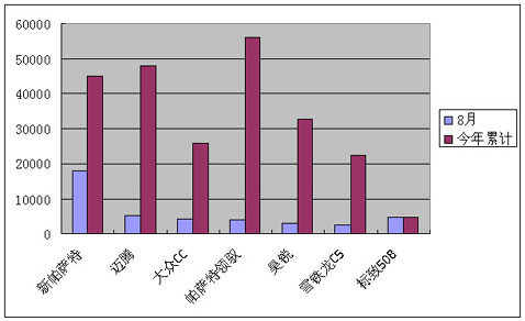 新帕萨特上市以来,表现十分抢眼,8月销售18006,今年累计销售45163辆;迈腾8月销售4984,今年累计销售47918,累计增幅-5.72%;大众CC 8月销售4201,今年累计销售25860,累计增幅312.05%;帕萨特领驭8月销售4009,今年累计销售55955,累计增幅-35.35%;昊锐8月销售3074,今年累计销售32713,累计增幅34.05%;雪铁龙C5 8月销售2517,今年累计销售22365,累计增幅-1.86%;标致508 上市第一月即销售4544辆,表现还算及格。