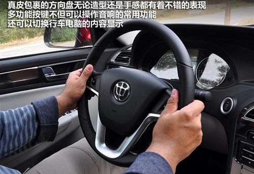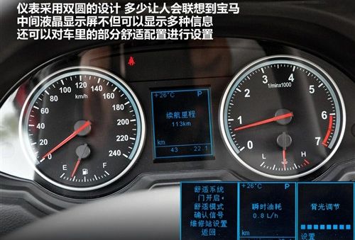 真皮包裹的方向盘握在手里很充实,多功能按键的手感也不错,虽然方向盘的造型多少让人感觉有些模仿的痕迹,但并没有让人感到反感。仪表采用了双圆的设计,中央显示屏里的信息很丰富,车外温度、瞬时油耗、续航里程等等,并且还可以通过方向盘上的多功能按键进行很多功能设定,给车主带来了一定的自主权。