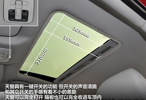 天窗具有一键开启和关闭功能,但是操作开关的声音太清脆了,和其它按键有着很鲜明的对比,质感上让人感觉到有着不小的差距,希望这部分能够加以改进。