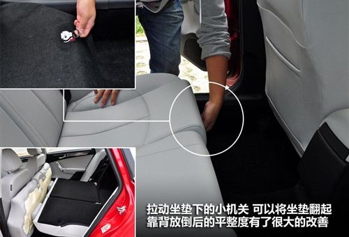后备厢的空间够大,也很规整,并且后排座椅可以按比例放倒。当需要更大的空间时,可以拉动坐垫下的小机关,然后将坐垫完全向前翻起。不过,坐垫是整体的,如果需要单独的放倒某一边的靠背,这样的方法就不适合了。