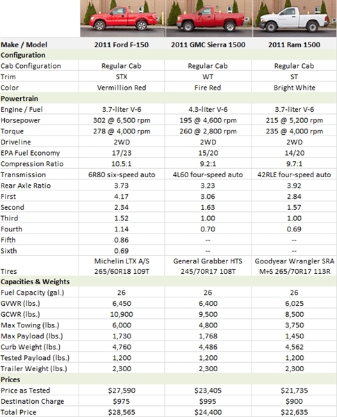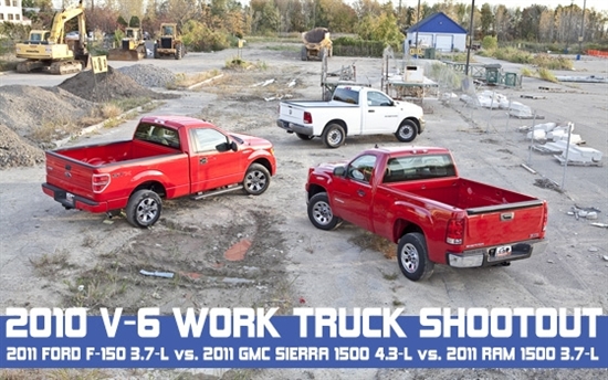 这次我们集合了福特、GMC以及道奇的三款入门级V6皮卡进行对比,这几款车的共同特点包括自然进气引擎、两门单排座舱、两轮驱动以及短货仓。实际上,我们还计划将丰田皮卡Tundra也加入到这次的对比测试中,2011款Tundra所搭载的4.0升V6引擎经过了动力提升达到了目前的270马力和377Nm的扭矩输出,比老款车型分别提高了34马力和16Nm的动力输出,遗憾的是车辆在运往我们测试地点的过程中发生了一些状况导致我们无法及时提到这款车。