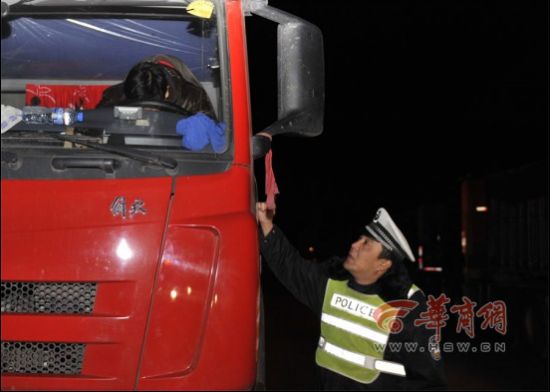 在神盘公路上,交警敲车门叫醒睡觉的司机,向前跟上。