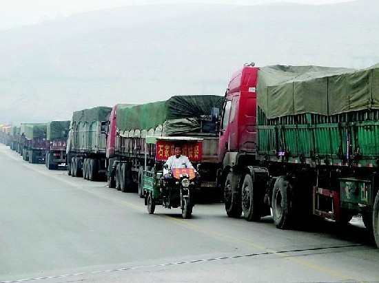 相比神盘公路的彻底堵死,府店公路上的司机要“幸福”得多。2011年12月5日,记者在现场看到,虽然由于超限检测站、收费站等站点的原因,运煤车辆在某些路段也会形成长蛇阵,但总体来说,运煤车辆是在缓慢地往前移动。“前两天山西下雪把车都堵在那边了,府谷这边的车能少些。这两天车流量又在回升,马上又会是一个高峰期,拥堵情况肯定会加剧。”府谷县交警大队大队长张志鹏说。
