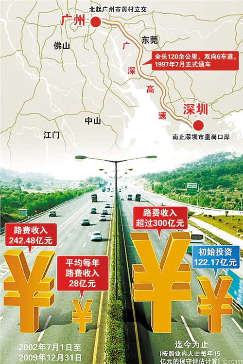 广深高速公路每天车流量超过10万余辆,每天征收过路费超过1000万元,但车多造成车速慢,被人们称为中国最赚钱“低速公路”。广深高速公路于上世纪八十年代立项建设,1997年7月正式通车。据有关人士分析,早在2010年以前,广深高速就已赚得“盆满钵满”。虽然广深高速的定价是省物价局核定的,标准为每公里0.6元。但广深高速部分路段收费接近核定标准两倍。华南快速干线一期的收费标准过高,也一直是公众诟病的焦点。华南快速路一期全长15.6公里。从黄埔大道入口到土华不足8公里,但华南快线(按一期全程)收费10元,平均每公里1.25元,是省物价部门核定的双向6车道及其以上0.60元/公里收费标准的2.08倍。