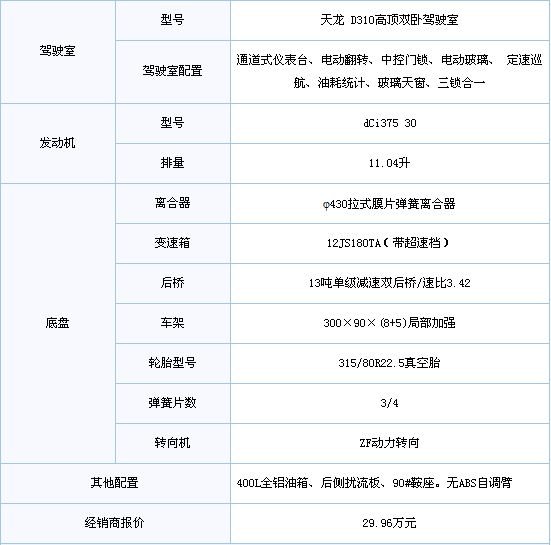 dCi轻量化普及版动力采用dCi375 30发动机,雷诺技术的dCi发动机具有低转速、大扭矩的特点,375马力也是目前重卡市场上最主流的马力段。与之匹配的是法士特12档变速箱,型号为12JS180TA,带超速档,后桥采用13吨单级减速,速比为3.42,这样的配置对天龙的速度有了保障,提升了运输的时效性。