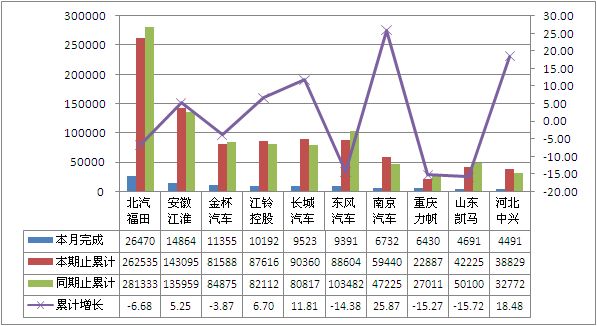 2012年9月货车生产190054辆,累计生产1702669辆,销售191020辆,累计销售1751583辆,同比累计增长分别为-4.55%和-5.53%。