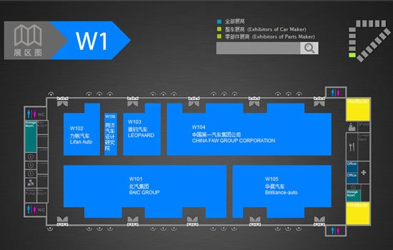 W1号馆: 整车,包括北汽集团、力帆、猎豹、一汽集团、华晨、同济汽车设计研究院等;