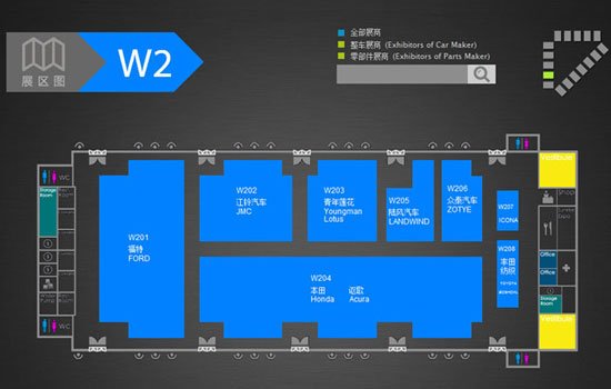 W2号馆: 整车,包括福特、江铃、青年莲花、本田、讴歌、陆风、众泰等;