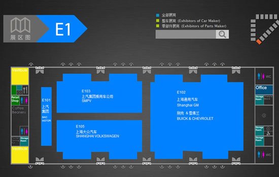 E1号馆: 整车,包括上汽集团、上海通用、别克和雪佛兰、上海大众、上汽集团乘用车等;