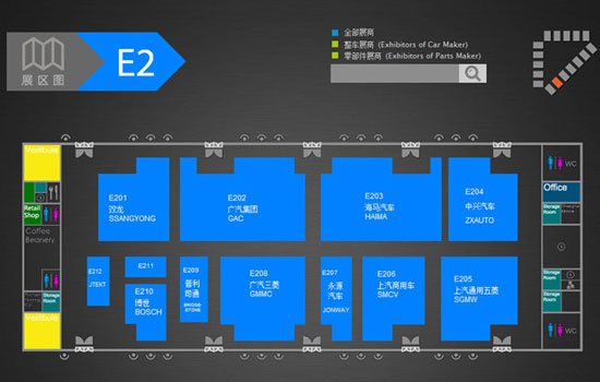 E2号馆: 整车,包括双龙、广汽集团、海马、中兴、上汽通用五菱、上汽商用车、永源、广汽三菱、普利司通、博世、汽车安全座椅、JTEKT等;