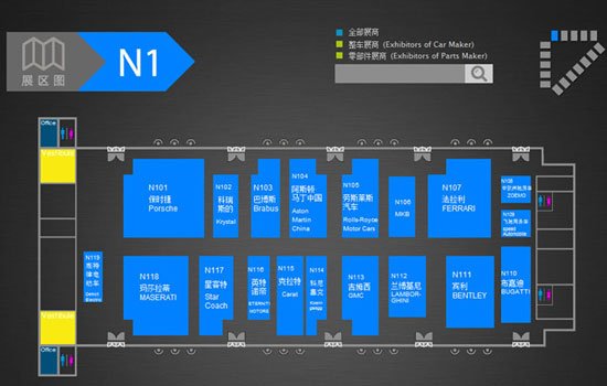 N1 号馆: 整车,包括保时捷、科瑞斯的、巴博斯、阿斯顿马丁、劳斯莱斯、MKB、法拉利、中欧奔驰房车、飞驰商务车、布嘉迪、宾利、兰博基尼、吉姆西、科尼塞克、克拉特、英特诺帝、星客特、玛莎拉蒂、底特律电动汽车等