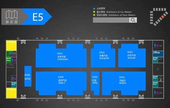 E5 号馆: 整车,包括长安、东南、铃木、马自达、欧宝、吉利、BOSE等