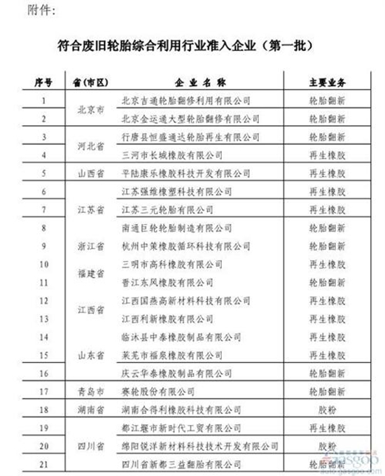 按照《工业和信息化部关于印发<废旧轮胎综合利用行业准入公告管理暂行办法>的通知》(工信部节〔2013〕86号)要求,现对符合准入条件要求的21家企业名单(第一批)予以公示,公开向社会和工业企业征求意见。