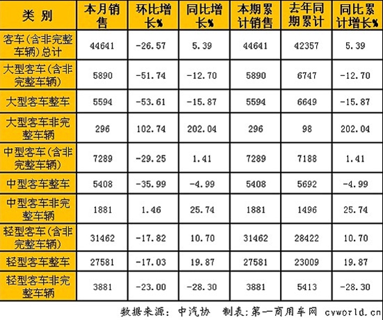 客车(含非完整车辆)1月份共计销售44641辆,环比下降26.57%,同比增长5.39%。其中,大型客车(含非完整车辆)销售5890辆,环比下降51.74%,同比下降12.70%;中型客车(含非完整车辆)销售7289辆,环比下降29.25%,同比增长1.41%;轻型客车(含非完整车辆)销售31462辆,环比下降17.82%,同比增长10.70%。