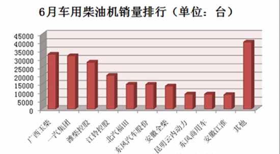 2014年6月份,车用柴油机销售222878台,销量排名前十的企业共计销售182771台,占据整个车用柴油机市场总销量82.00%的份额。排名如下: