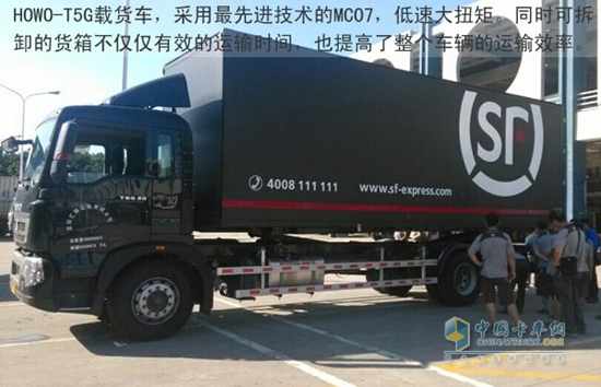 同时T5G 重卡的货箱均为可拆卸的货箱,这样大大的提高了效率实现了甩挂的配送。T5G载货车是中国重汽在载货车市场的一个新作,重汽深圳分公司的李经理介绍到:“T5G载货车立足中短途的货运配送,车辆运行到一定里程数其油耗会表现的更加出色。从顺丰使用反馈看,车辆的品质得到了用户的高度认可。”