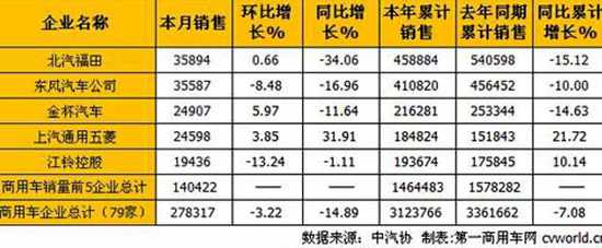 销售情况分企业看,10月份销量排名前5的商用车企业依次为:北汽福田、东风汽车公司、金杯汽车、上汽通用五菱和江铃控股。5家企业10月份共销售140422辆,占10月份商用车总销量(278317辆)的50.45%。