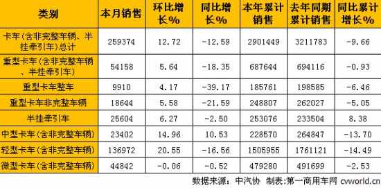 其中,重型卡车(含非完整车辆、半挂牵引车)共销售54158辆(整车销售9910辆,半挂牵引车销售25604辆,非完整车辆销售18644辆),环比增长5.64%,同比下降18.35%;中型卡车(含非完整车辆)销售23402辆,环比增长14.96%,同比增长10.53%;轻型卡车(含非完整车辆)销售136972辆,环比增长20.55%,同比下降16.56%;微型卡车(含非完整车辆)销售44842辆,环比微降0.06%,同比微降0.52%。