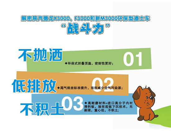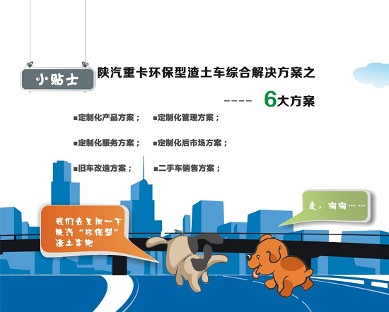 陕汽根据雾霾天气对城市环境危害,针对老式渣土车“抛、洒、遗、漏”的弊端,开发出新型环保、智能、安全渣土车,该车是基于行业现状,根据国四排放法规要求,利用天行健智能管理系统开发的车型,具有排放低、密封严、无抛洒、无遗漏、不积土、管理细、无盲区、安全性高等特点,并为客户提供6大综合解决方案。目前已在北京、上海、湖南、山东、河南、浙江等省市批量投入使用,重新定义城市渣土车新标准,成为拨雾去霾的城市大使。
