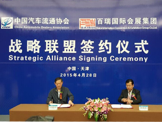为响应国发[2015]15号文件:"国务院关于进一步促进展览业改革发展若干意见"的出台,中国汽车流通协会与百瑞国际会展集团有限公司,于2015年4月28日在天津签署战略联盟协议。作为中国汽车流通领域具有重要地位的中国汽车流通协会与在我国会展业具有重大影响力和雄厚业务能力的百瑞国际会展集团的强强联合,必将对中国汽车流通行业更好更快的发展起到积极的推动作用,也开启了会展龙头企业与行业权威协会合作的新模式,必将为我国会展业的发展注入新的活力。