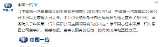 官方微博原文如下:2015年5月7日,中国第一汽车集团公司召开中层以上管理人员大会。中共中央组织部干部五局局长毛定之宣布了党中央、国务院关于中国第一汽车集团公司主要领导变动的决定:徐平同志任中国第一汽车集团公司董事长、党委书记。董事长职务的任免,按有关法律和章程办理。