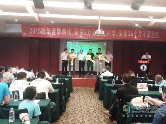 唐山市辰辉汽车贸易有限公司总经理葛洪明宣布现场订车政策,大客户天津天钢联合特钢有限公司采购部部长现场签约40辆,两家大客户唐山港陆物流有限公司和唐山市丰润区振超运输有限公司现场各交付车辆20辆,葛总将象征着财富的大钥匙分别交于大客户手中。