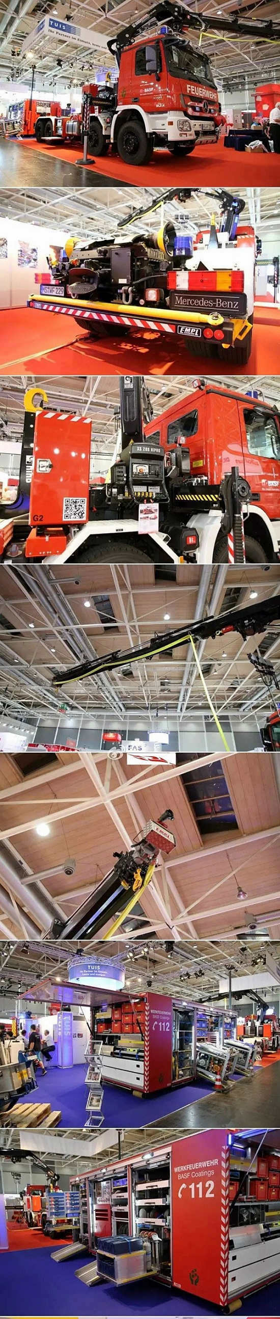 由安普公司为德国北威州明斯特地区的BASFCoatingsGmbH工厂消防队生产的拉臂钩式多功能消防车,使用以MB Actros3241四轴底盘,其随车吊为HIABXS288-E6“Hipro”27.6mt,可遥控并附带水和泡沫喷洒功能(射速每分钟1325升)滚装箱装有一台60kVA发电机以及多种救援设备和工具!