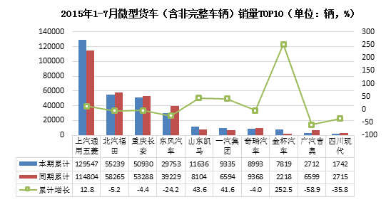 2015年7月国内微型货车产量36054辆,累计产量300265辆,同比增长2.46%,累计增长-1.91%;本月国内微型货车销量38204辆,累计销量307794辆,同比增长7.14%,累计增长1.08%。其中,上海通用五菱累计销售微型货车129547辆,排名第一,累计增幅为12.8%;累计销量前十五名中,金杯汽车销量增幅最大,增幅超过了250%,累计销量为7819辆。