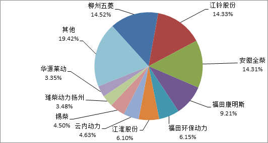 轻卡配套动力方面,从2015年1-7月配套信息来看,配套前三的发动机企业分别是柳州五菱、江铃股份和安徽全柴,前三家发动机企业占据轻卡配套市场的43.16%,第四、五的发动机企业分别是福田康明斯和福田环保动力,前五家发动机企业占据轻卡配套市场的58.52%,前10家发动机企业占据轻卡配套市场的80.58%,由此可见,全国情况发动机配套市场行业集中度相对较高。