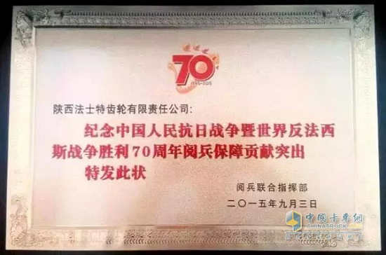 阅兵仪式圆满结束后,阅兵联合指挥部、装备方队指挥部、装备保障方队分别为陕西法士特齿轮有限责任公司颁发了“阅兵保障贡献突出”、“装备保障先进单位”、“军工产品质量第一”等奖牌,阅兵联合指挥部为法士特技术服务人员颁发了荣誉证书,高度肯定了法士特公司在70周年大阅兵中做出的贡献。