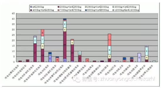 按纯电动环卫车各类公告车型的总质量分布进行汇总分析,如图所示。