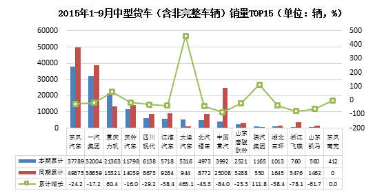 2015年9月国内中型货车产量17418辆,累计产量134566辆,同比增长 -7.16%,累计增长-25.58%;本月国内中型货车销量16494辆,累计销量135606辆,同比增长-17.75%,累计增长-25.02%。其中,东风汽车累计销售中型货车37789辆,排名第一,累计降幅为24.2%;累计销量前十五名中,大运汽车累计销量增幅超过了100%,增幅最大,累计销量为5316辆。