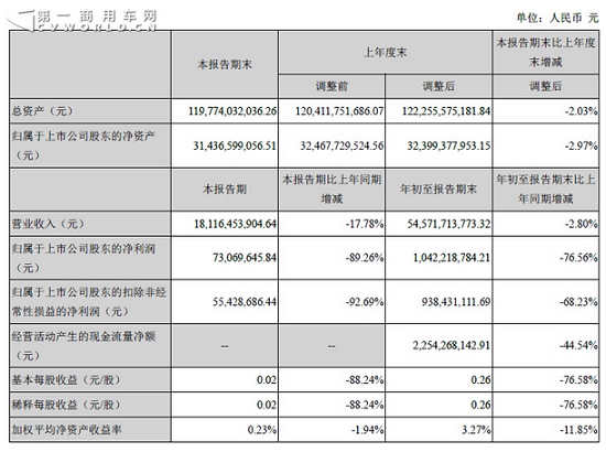 10月30日,潍柴动力股份有限公司发布2015年第三季度报告。报告显示,第三季度(7-9月份),潍柴股份公司营业收入181.16亿元,较去年同期下降17.78%;归属于上市公司股东的净利润73.07百万元,较去年同期下降89.26%。前三季度(1-9月份),潍柴股份营业收入545.72亿元,较去年同期下降2.8%,其中归属于上市公司股东的净利润10.42亿元,较去年同期下降76.56%。