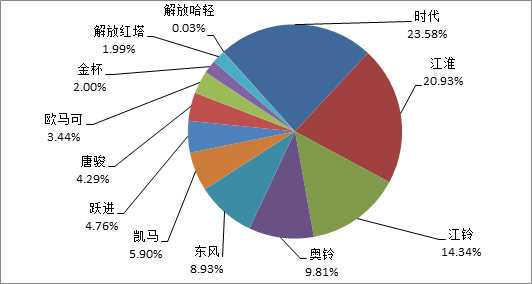 从1-10月份各品牌轻卡市场份额可以看出,时代轻卡占主流轻卡总销量的比重最大,达到23.58%,前三名品牌轻卡共占据主流轻卡企业总销量的58.85%,行业集中度较高,占据轻卡市场的半壁江山。