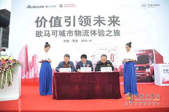 欧马可营销公司服务总监彭仕顺先生、福田康明斯高级业务发展经理王宏忠先生共同为欧马可开启西北地区城市物流体验之旅