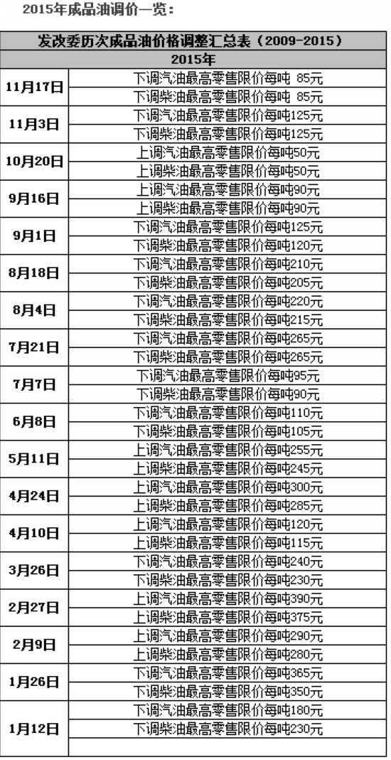 据悉,截止目前2015年内我国油价共经历22轮调价周期,其中十一次下调,七次上调,另有四次因幅度不足50元/吨而暂不调整。共累计汽油下调525元/吨,柴油下调575元/吨;折合零售汽油每升下调0.38元/升,柴油每升下调0.51元/升。