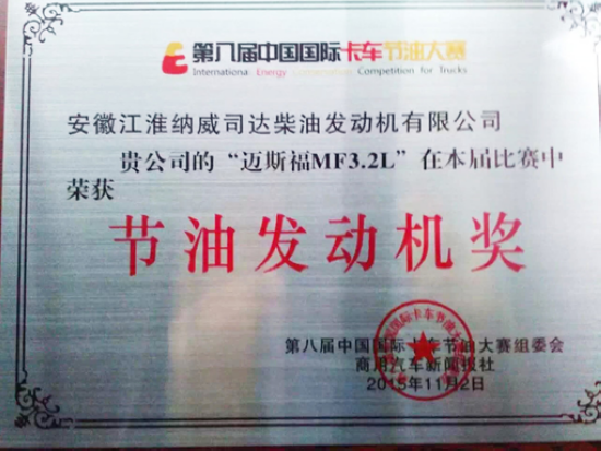 11月25日,第八届中国国际卡车节油大赛(以下简称“节油大赛”)颁奖典礼在京举行。由安徽江淮纳威司达柴油发动机有限公司(以下简称“江淮纳威司达”)生产的 “迈斯福MF3.2L”不出所料地斩获“节油发动机奖”。不仅如此,在此次节油大赛中,凭借两款迈斯福发动机的出色表现,搭载迈斯福3.2升发动机的江淮帅铃车型荣获3.0-3.2L轻卡组冠军,搭载迈斯福4.8升发动机的江淮格尔发K6车型荣获了165马力以下中卡载货车组节油冠军。