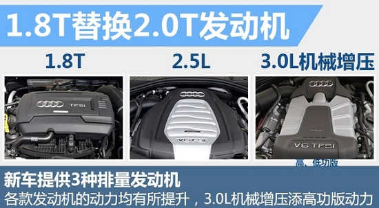 近日从奥迪内部人士获悉,新款奥迪A6L将于明年1月份正式上市。新车将换装小排量发动机,由1.8T发动机替换现款的2.0T发动机,并取消现有2.8发动机。此外,在保留现款3.0L机械增压动力的同时,新车还将增加一款3.0L机械增压高功版车型,车辆搭载的发动机最大功率有望达245千瓦。通过对发动机进行全新调校,各款发动机的动力均有所提升,其中1.8T发动机的最大输出功率达140千瓦,2.5L自然吸气发动机达到150千瓦。3.0L机械增压基本版车型动力与现款3.0机械增压车型动力保持一致,但新增的3.0L机械增压高功版车型,最大功率可达245千瓦,动力大幅提升。