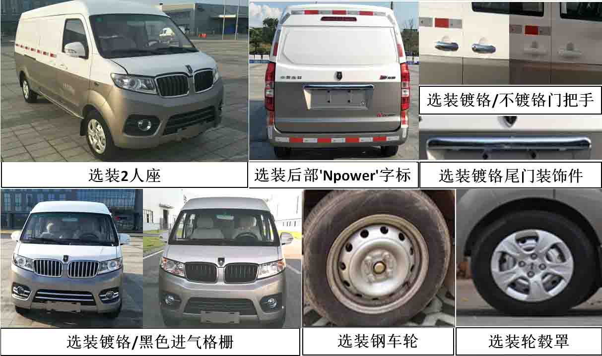| 备注 | 驾驶区与货舱有效隔离,货舱封闭,顶部不可开启。选装2人座、钢车轮、轮毂罩、EPS、倒车雷达、镀铬/黑色进气格栅、镀铬/不镀铬门把手、镀铬尾门装饰件、后部"Npower"字标、PVC侧围+PVC革地板、PVC侧围+铝地板、铝板侧围+铝地板。选装限速装置,限速95km/h。发动机功率为63kW,最大净功率为60kW。选装ABS型号WX80, 厂家为浙江万向精工有限公司。选装ABS型号APG3550500G,厂家为浙江亚太机电股份有限公司。带OBD。175/70R14C轮胎型号的负荷指数是95。 | ||