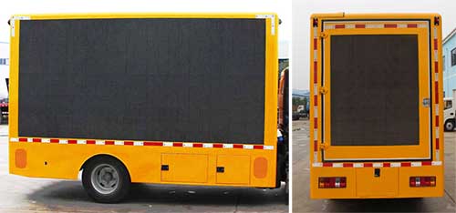 | 备注 | 1、该车是进行宣传推广的专用车辆,两侧可按用户要求粘贴各种表示、图案;2、左右后三侧都可选装LED屏,导流罩为选装件;3、选装轴距2850mm对应整车长5490mm,选装2600轴距对应整车长5240mm。 | ||