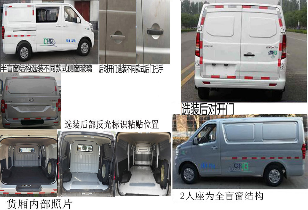 | 备注 | 带IUPR监测功能,选装前雾灯;选装后部对开门;后对开门选装不同款式的后门把手;选装与车身同色或不同色后视镜;选装不同款式前格栅;选装钢车轮毂或铝轮毂,选装不同款式车轮装饰罩;选装全盲窗结构;半盲窗结构选装不同款式的侧窗玻璃;选装不同款式的后背门装饰条;选装后背掀门时2人座整备质量为1490kg,载质量为735kg,选装2+2,2+3人座时整备质量为1535kg,载质量分别为560kg,495kg;选装后对开门时2人座整备质量为1535kg,载质量为690kg,选装2+2,2+3人座时整备质量为1560kg,载质量分别为535kg,470kg;ABS系统型号:WX80; ABS系统厂家名称:浙江万向精工有限公司;发动机净功率为77kW(汽油)/68.5kw(CNG). | ||
