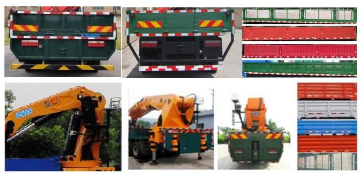 | 备注 | 1.本车型已安装侧面和后部反光标识;2.上装折臂式起重机型号为BS430或BS560或GD52000或SQ500,自重为3970kg,最大起升载荷为14340kg,3.防护材料均为Q235,均为螺栓联接,后防护由后部裙板代替,离地高为550毫米;4.随底盘厂选装驾驶室,选装保险杠,选装不同的货箱栏板结构,5.该车安装带卫星定位功能的行驶记录仪,安装ABS型号:ABS/ASR-24V-4S/4M,ABS生产企业:东风电子科技股份有限公司. | ||