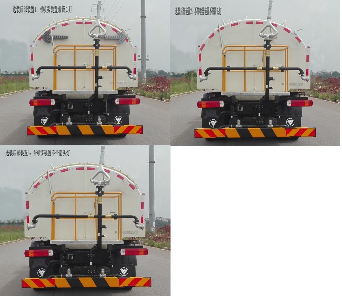 | 备注 | 防护装置材料:Q235A;后防护装置断面尺寸:150×60mm,后防护离地高度:500mm;防护装置连接方式:螺栓连接,安装具有卫星定位功能的行驶记录仪.ABS系统控制器的生产企业:东风电子科技股份有限公司;ABS系统型号:ABS/ASR-24V-4S/4M(控制器型号:3550X-1010).配置矩形罐时:罐体有效容积14.3立方米,罐体外形尺寸(长轴×短轴×长度)(mm):2300×1270×6000.介质名称:水,介质密度:1000千克/立方米;配置椭圆罐时:罐体有效容积13.84立方米,罐体外形尺寸(长轴×短轴×长度)(mm):2300×1570×5740.介质名称:水,介质密度:1000千克/立方米.选装前喷淋装置(前伸600mm). | ||