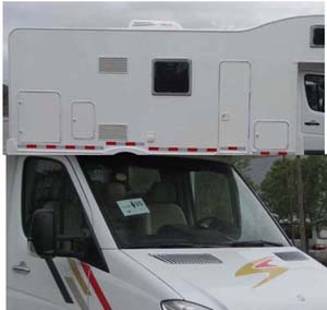 备注 | 主要专用装置有睡具,燃气灶,卫生间及冰箱等;发动机净功率190kw,选装侧面无遮阳棚,此时车宽2350mm,选装前进气格栅,车门外拉手等外部部件不锈钢覆盖件;车后选装自行车托架;ABS系统控制器型号:ABS ESP 8.1,厂家Bosch; |